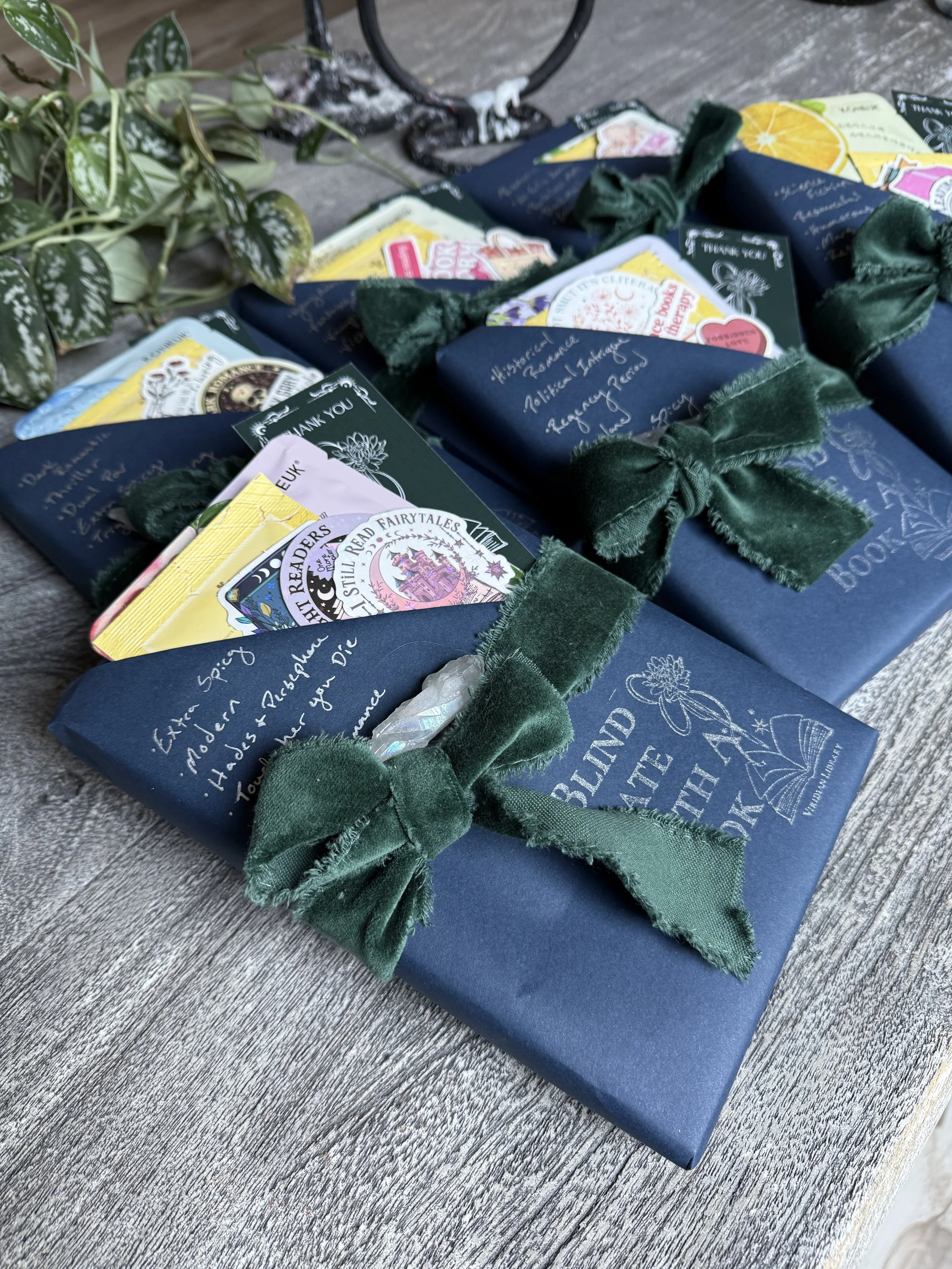Every Blind Date book comes beautifully wrapped in paper with a viridian green ribbon and teaser words. Also included is a bookmark, tea, stickers, crystals, and a face mask. Be sure to check the product description for details!